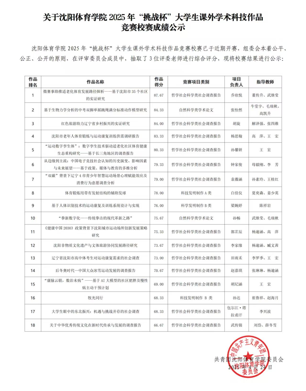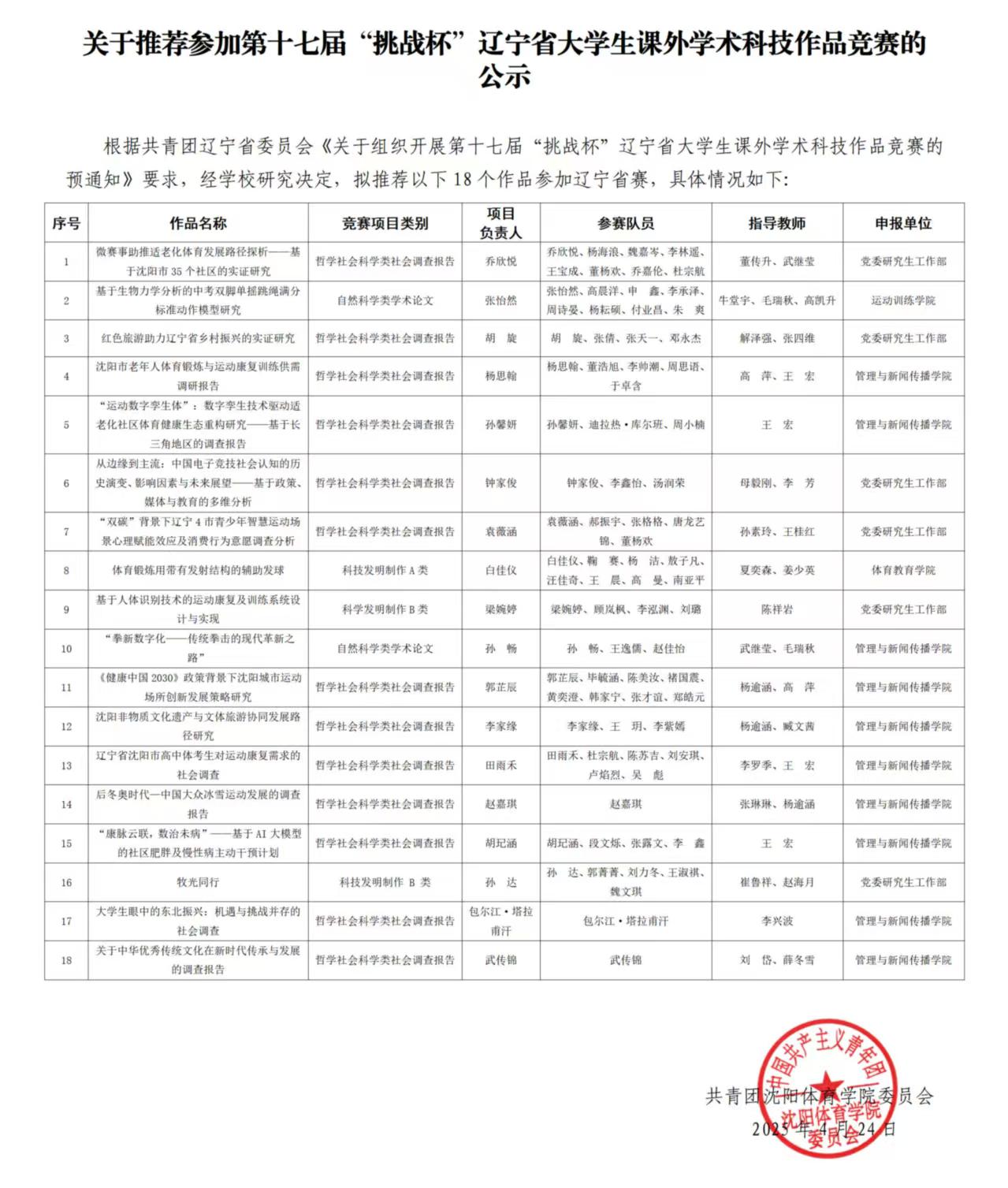 沈阳体育学院 2023-2024 学年共青团“两先两优”和“优秀青年志愿者、服务队”“优秀社团干部、成员”评选结果名单公示