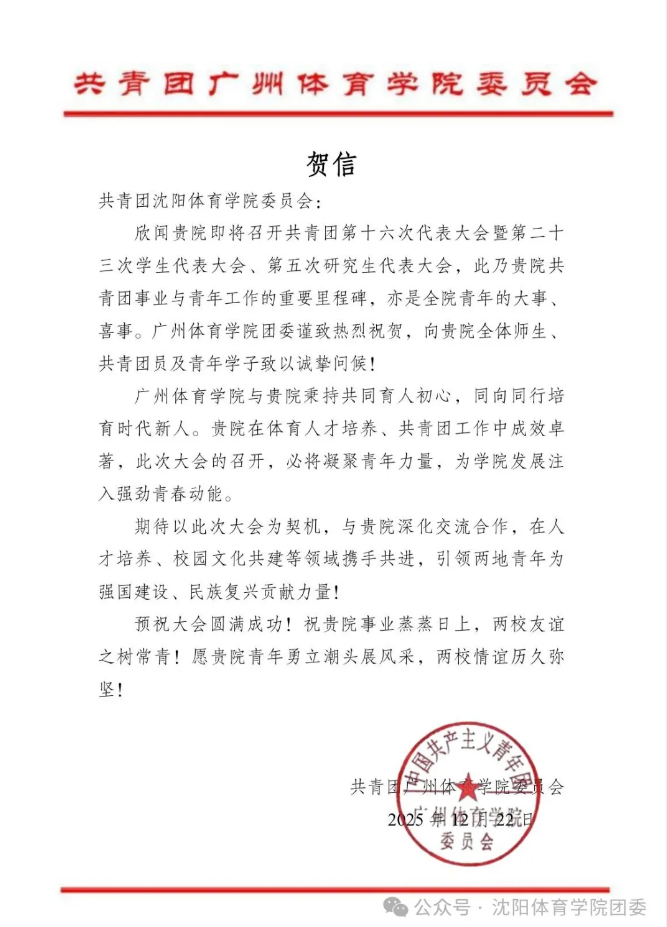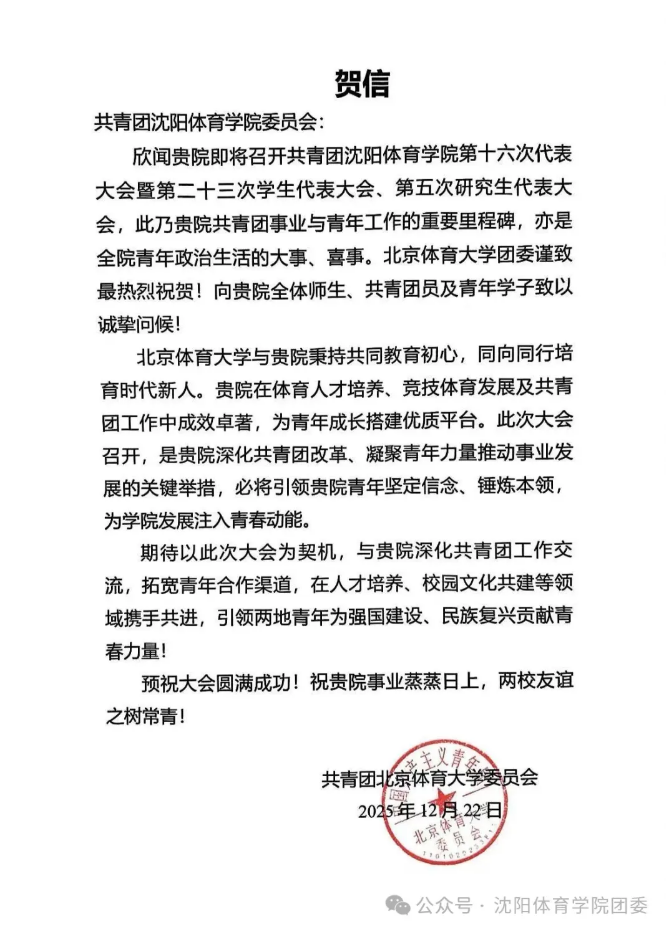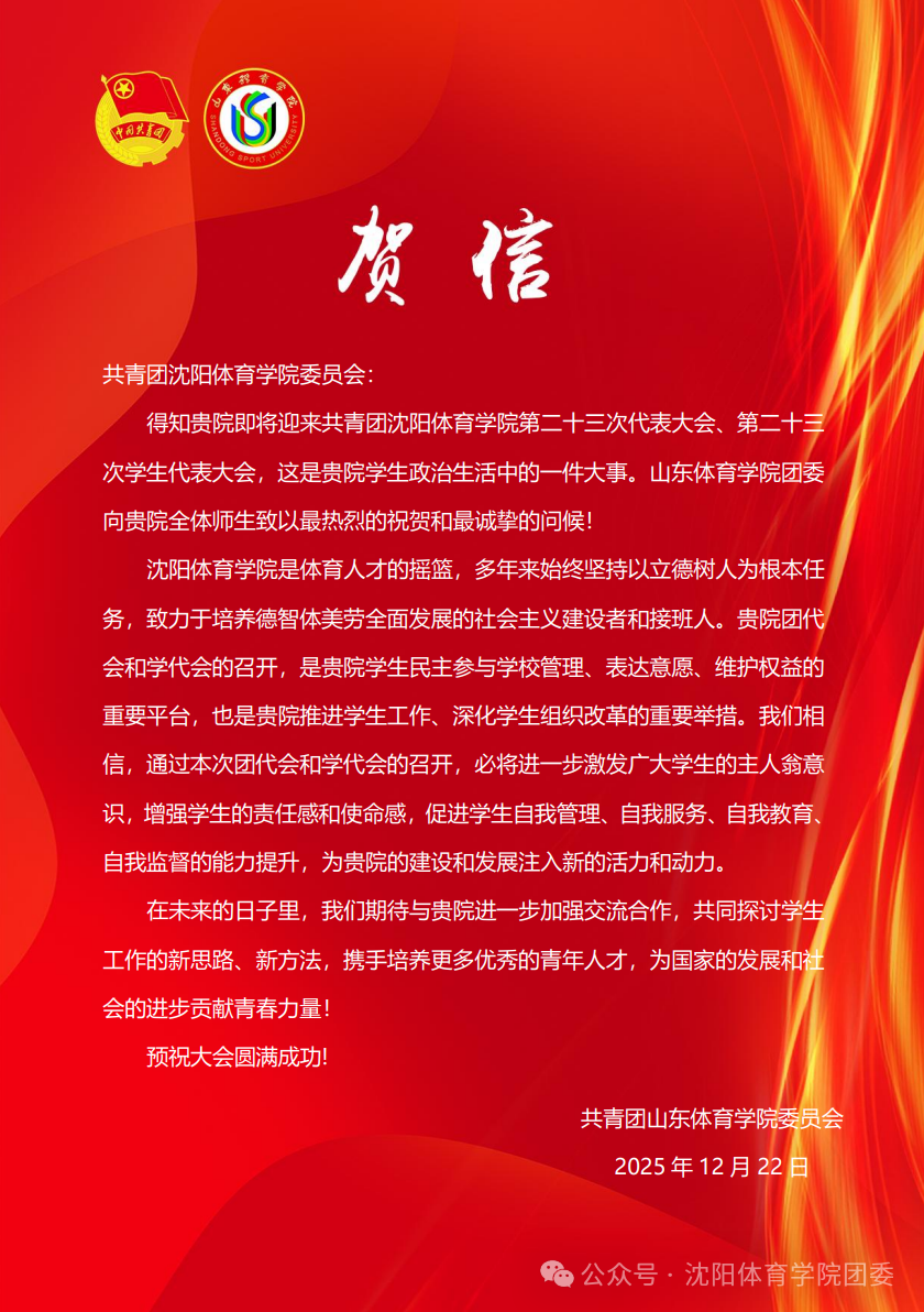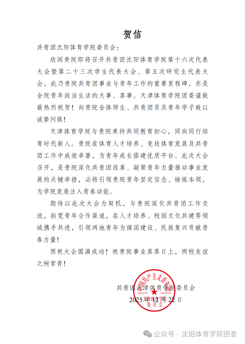 北京体育大学团委在贺信中指出,大会的召开是沈阳体育学院共青团事业发展的重要里程碑,高度肯定我校在人才培养、竞技体育等领域取得的卓著成效,期待与我校深化共青团工作交流、共建校园文化,携手引领青年学子为强国建设赋能。
