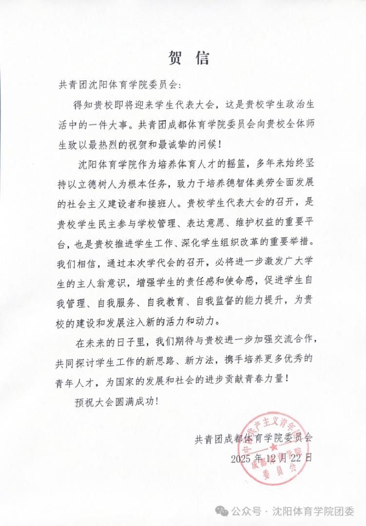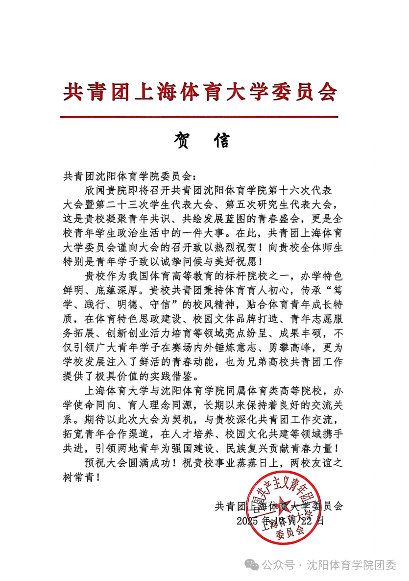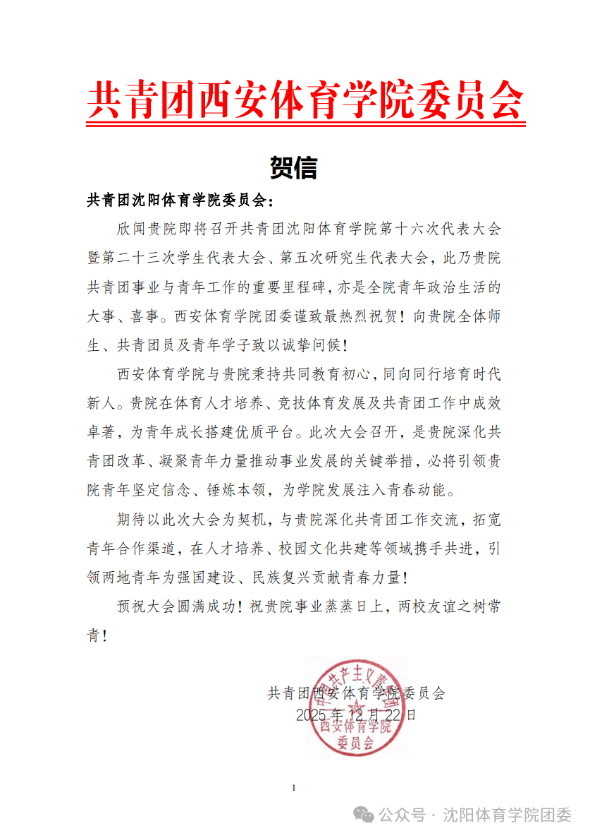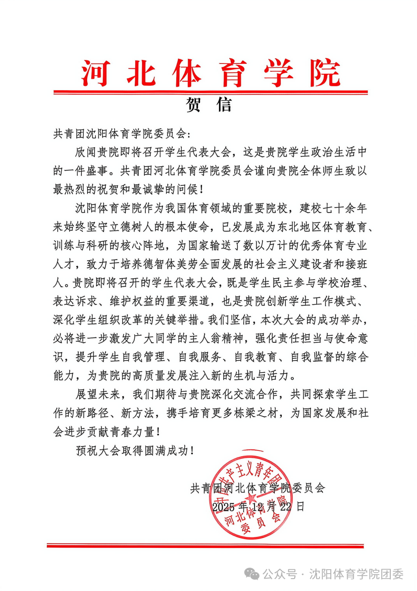 北京体育大学团委在贺信中指出,大会的召开是沈阳体育学院共青团事业发展的重要里程碑,高度肯定我校在人才培养、竞技体育等领域取得的卓著成效,期待与我校深化共青团工作交流、共建校园文化,携手引领青年学子为强国建设赋能。
