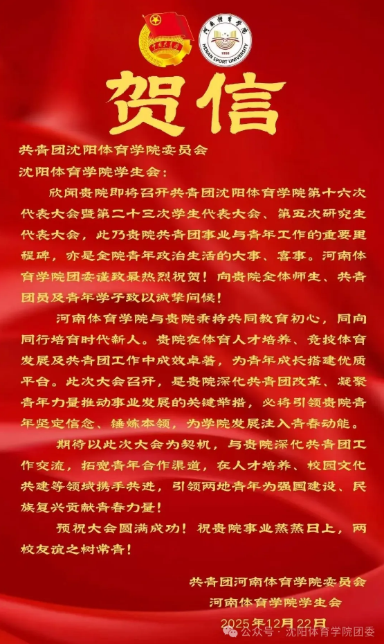 各兄弟院校均衷心预祝沈阳体育学院团学研代会圆满成功,祝愿我校事业蒸蒸日上、再谱新篇,愿与我校持续深化合作,引领广大青年学子在强国建设、民族复兴的伟大征程中绽放青春光彩。(排名顺序按贺信收到时间为准)